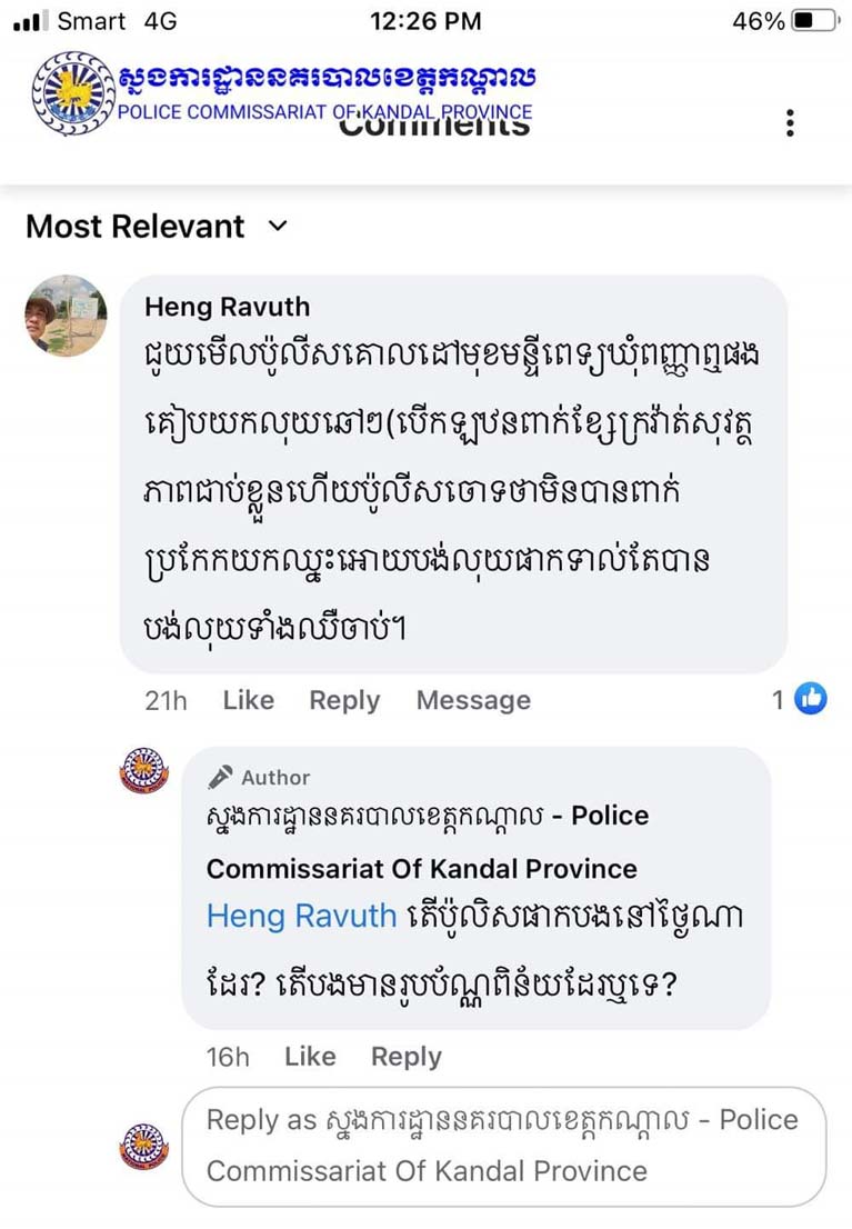 ក្រោម​ការបញ្ជា​ដឹកនាំ​ពី​លោក​ឧត្តមសេនីយ៍ទោ ឈឿន សុ​ចិត្ត ស្នងការ​នគរបាល​ខេត្ត​កណ្តាល ក្រុមការងារ​ព័ត៌មាន និង​ប្រតិកម្ម​រហ័ស នៃ​ស្នងការដ្ឋាន​នគរបាល​ខេត្ត​កណ្តាល សូម​ធ្វើ​ការឆ្លើយតប​ជូន​សាធារណជន និង​គណនី​ហ្វេ​សប៊ុក​ឈ្មោះ Heng Ravuth ដែល​បាន ខ​មិន ក្នុង​ហ្វេ​សប៊ុក​ផេក​ស្នងការដ្ឋាន​នគ​របាល​ខេត្ត​កណ្ដាល កាលពី​ថ្ងៃ​ទី​១៨ ខែ​សីហា ឆ្នាំ​២០២១ មាន​ខ្លឹមសារ​ថា​៖ “​ជួយ​មើល​ប៉ូលីស​គោលដៅ​មុខ​មន្ទីរពេទ្យ​ឃុំ​ពញាឮ​ផង គៀប​យក​លុយ​ឆៅៗ (​បើកឡាន​ពាក់​ខ្សែក្រវ៉ាត់​សុវត្ថិភាព​ជាប់​ខ្លួន​ហើយ ប៉ូលីស​ចោទថា​មិន​បាន​ពាក់ ប្រកែក​យកឈ្នះ​អោយ​បង់លុយ​ផាក​ទាល់តែ​បាន បង់​លុយ​ទាំង​ឈឺចាប់​ផង​”​។​