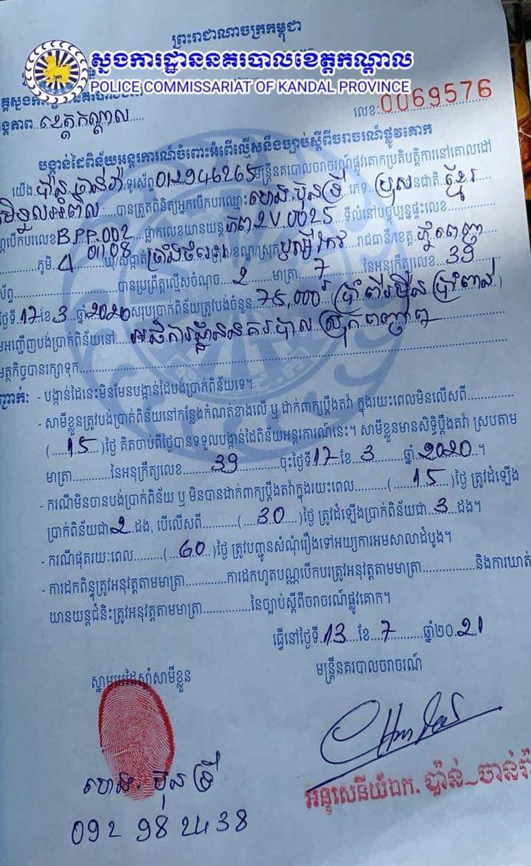 ​ជា​លទ្ធផល​៖ កាលពី​ថ្ងៃ​ទី​១៣ ខែកក្កដា ឆ្នាំ​២០២១ កម្លាំង​ផ្នែក​សណ្ដាប់ធ្នាប់ និង​ចរាចរណ៍ នៃ​អធិការដ្ឋាន​នគរបាល​ស្រុក​ពញាឮ បាន​ឃាត់​រថយន្ត​ម៉ាក TOYOTA CAMRY ពណ៌​ស ពាក់​ស្លាក​លេខ ភ្នំពេញ 2V-0025 បើកបរ​ដោយ​ឈ្មោះ ហេង ប៊ុន​ទ្រី (​ត្រូវជា​កូន​របស់​ម្ចាស់​គណនី Heng Ravuth) ភេទ​ប្រុស ដែល​បើកបរ​រថយន្ត​មាន​ទិសដៅ​ពី​ត្បូង ទៅ​ជើង​(​ភ្នំពេញ​-​ឧដុង្គ​) មិន​ពាក់​ខ្សែក្រវ៉ាត់​សុវត្ថិភាព ក៏​ត្រូវបាន​កម្លាំង​អង្កេត​មេ​ី​ល​បទល្មើស​ចរាចរណ៍ ដែល​ឈរជើង​នៅ​គោលដៅ​ដើមទី (​មុខ​មណ្ឌល​សុខភាព​ឃុំ​ពញាឮ​) ប្រទះ​ឃើញ​អ្នកបើកបរ​ខាងលើ​មិន​ពាក់​ខ្សែក្រវ៉ាត់ ក៏​ផ្តល់​ព័ត៌មាន​(​បោះ​ដៃ​) តាម​វិទ្យុទាក់ទង​ទៅ​គោលដៅ​ផាកពិន័យ ដើម្បី​ឃាត់​រថយន្ត​។ ខណៈនោះ អ្នក​បេ​ី​កបរ​ឃើញ​នគរបាល​ចរាចរណ៍ ក៏​ស្រ​វ៉ា​ទាញ​ខ្សែក្រវ៉ាត់​សុវត្ថិភាព​មក​ពាក់​។ បន្ទាប់មក​ក៏​ត្រូវបាន​កម្លាំង​ចរាចរណ៍​ឈរជើង​នៅ​គោលដៅ​ផាកពិន័យ ចំណុច​មុខ​ប៉ុស្ដិ៍នគរបាល​រដ្ឋបាល​ពញាឮ ឃាត់​រថយន្ត​បាន ហើយ​សមត្ថកិច្ច​បាន​និយាយថា​ប្អូន​បើកបរ​មិន​ពាក់​ខ្សែក្រវ៉ាត់ ចំណែក​អ្នកបើកបរ​រថយន្ត​នោះ​បាន​តប​វិញ​ថា​ខ្ញុំ​ពាក់​ខ្សែក្រវ៉ាត់​មក​តាំងពី​ផ្ទះ​។ សមត្ថកិច្ច​ក៏​បាន​អញ្ជេី​ញគាត់​ចុះ​មក​ជួប​អ្នកដោះស្រាយ ពេលនោះ​អ្នកបើកបរ​រថយន្ត​មិន​បាន​និយាយ​ជាមួយ​អ្នកដោះស្រាយ​ទេ​។ ប៉ុន្តែ​គាត់​បាន​ទំនាក់ទំនង​តាម​ទូរស័ព្ទ​ទៅកាន់​អាណាព្យាបាល​របស់​គាត់ (​អាច​ជា​ម្ចាស់​គណនី​ខាងលើ​)​ថា​៖”​ប៉ា​ខ្ញុំ​ពាក់​ខ្សែក្រវ៉ាត់​តាំងពី​ផ្ទះ ហើយ​គាត់​ក៏​បាន​បិទ​ទូរស័ព្ទ​” និង​បន្ត​ទំនាក់ទំនង​ជា​លើក​ទី​២ នៅពេល​សន្ទនា​តាម​ទូរស័ព្ទ​ចប់ សា​ម៉ី​ខ្លួន​បាន​និយាយ​មក​កាន់​សមត្ថកិច្ច​ថា​សរសេរ​ប័ណ្ណ​ឱ្យ​ខ្ញុំ​មក ចាំ​យក​ទៅ​បង់​នៅ​ស្នងការ (​ដោយ​ស្ម័គ្រចិត្ត គ្មាន​ការគាបសង្កត់ ឬ​បង្ខិតបង្ខំ​យក​ប្រាក់​ពី​កម្លាំង​សមត្ថកិច្ច​ឡេ​ី​យ​)​។​