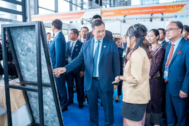នាព្រឹកថ្ងៃអាទិត្យ ទី១៧ កញ្ញា ២០២៣ ទីក្រុងណាននីង ខេត្តក្វាងស៊ី សាធារណរដ្ឋប្រជាមានិតចិន សម្ដេចមហាបវរធិបតី ហ៊ុន ម៉ាណែត នាយករដ្ឋមន្ត្រីនៃព្រះរាជាណាចក្រកម្ពុជា និងលោកជំទាវ អញ្ជើញចូលរួមពិធីកាត់ខ្សែបូ សម្ពោធស្តង់ពិព័រណ៍កម្ពុជា និងសម្ពោធពន្លាជាតិកម្ពុជា ព្រមទាំងចូលរួមទស្សនាផលិតផលជាច្រើនរបស់កម្ពុជា ដែលកំពុងដាក់តាំងបង្ហាញនៅក្នុងកម្មវិធី “ពិព័រណ៍អាស៊ាន-ចិនលើកទី២០” ។